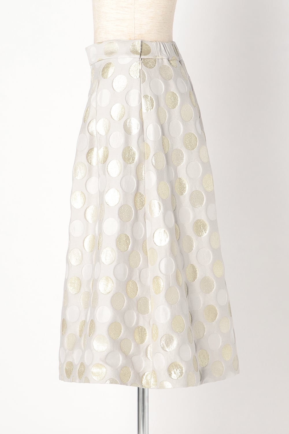 ●華やかな桐生の老舗ファクトリーで丁寧に織られた金糸・銀糸を使ったコイン型のジャガード素材のもつ膨らみ感を活かしたタック入りのフレアスカートです。コットン素材で驚くほど軽く、後ろのみゴムを使用し、デザイン性と着心地の良さが持ち味です。