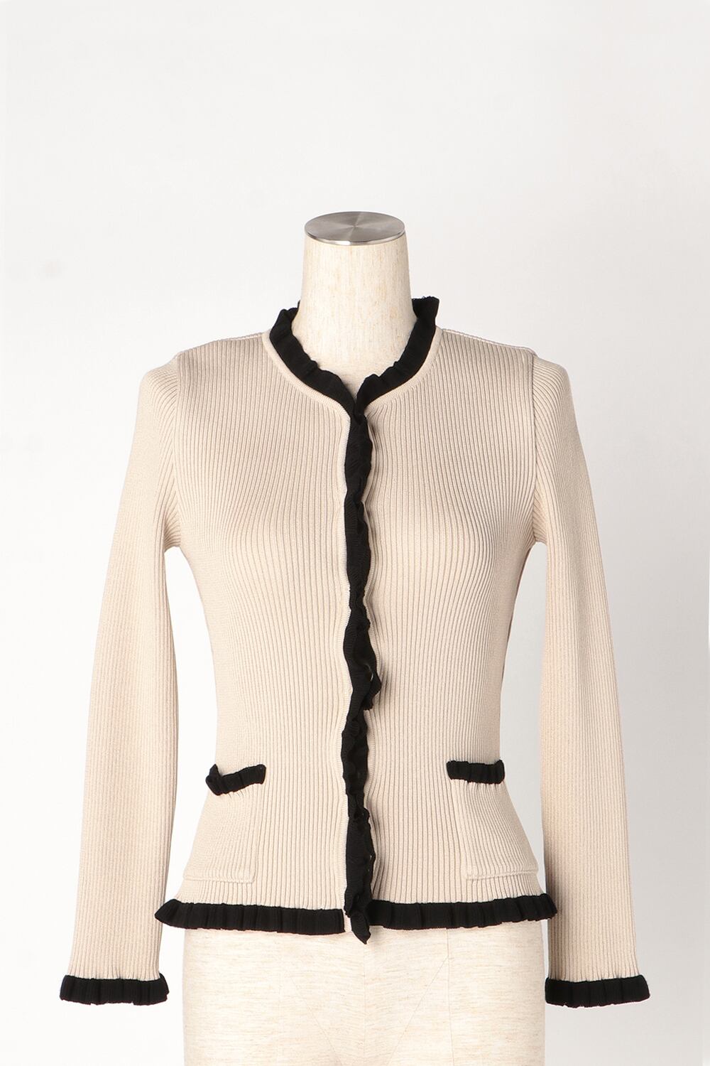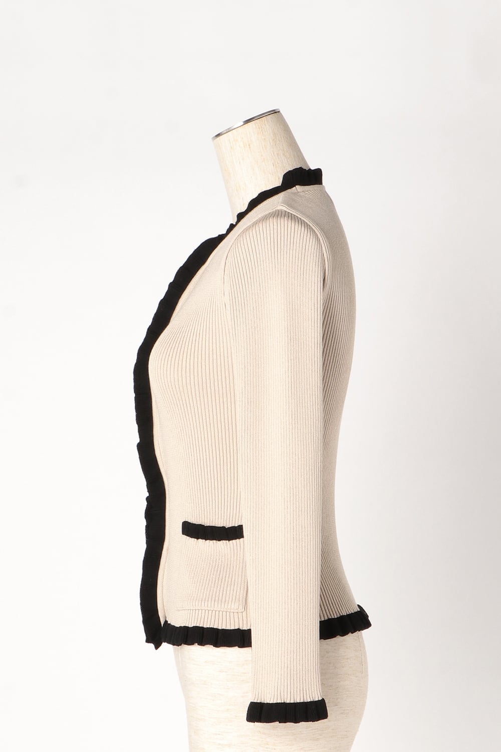 ●ベージュ×ブラックの品のよい配色でジャケット風に仕立てた「着心地がよく、きちんと感のある」カーディガンです。フロントのボタンを閉じるとタテにおきるフリルは、甘すぎず、大人女性の上品さと可愛らしさを引きたてます。
